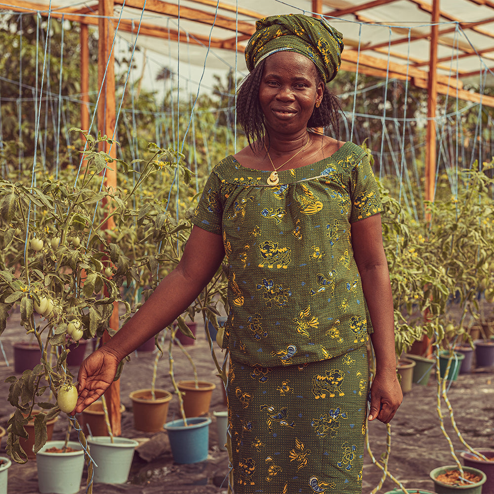 In een kas op een cacaoplantage bij San Pédro in Ivoorkust verbouwt een groep lokale vrouwen groenten en fruit in een kas. In dat gebied is het niet mogelijk om groenten en fruit te verbouwen vanwege de bodemgesteldheid, het gebrek aan water en de hitte. Maar met onze kas, de juiste bodem en watervoorziening hebben we bijgedragen aan een voedzame toekomst voor onze cacaoboeren en hun gezinnen.
