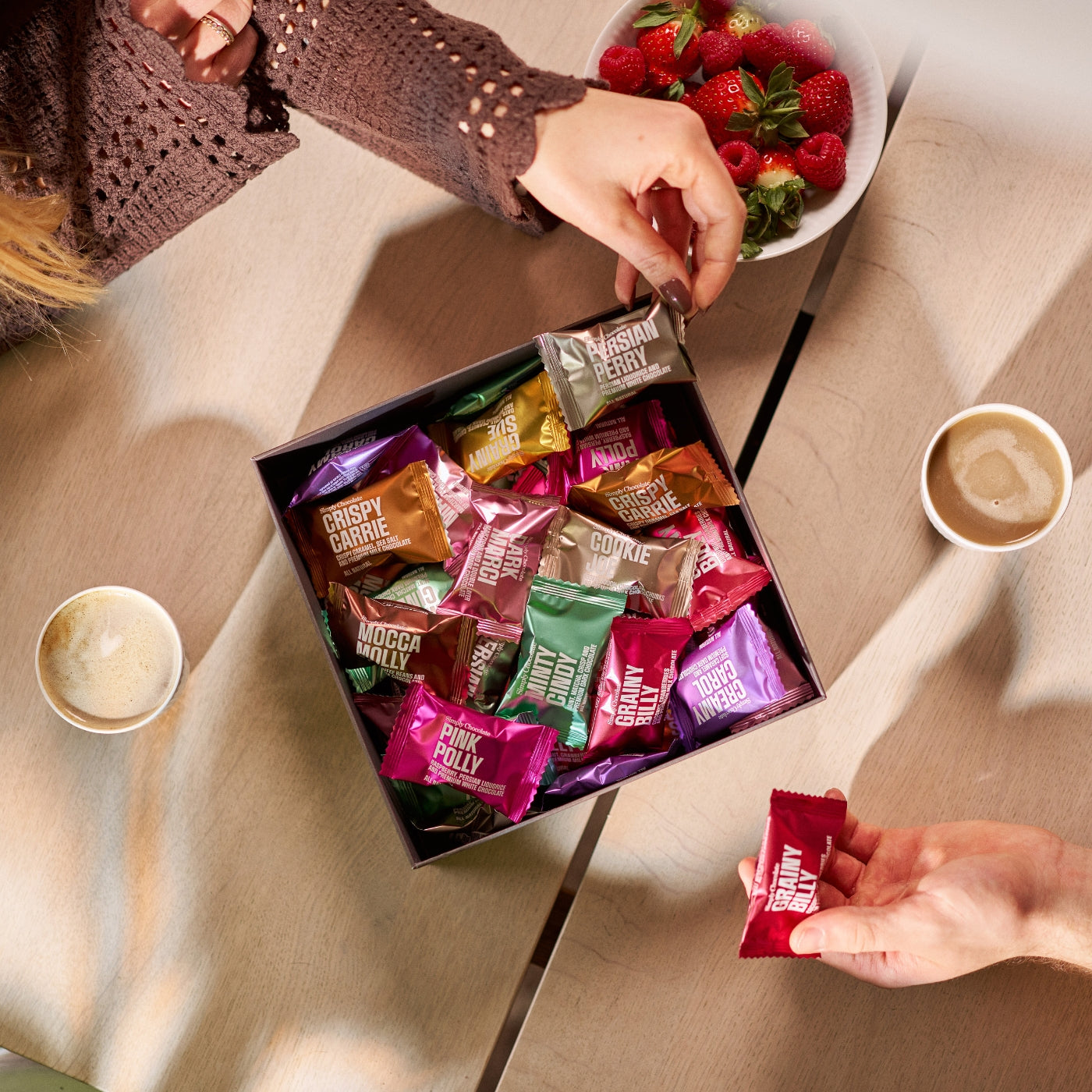 Ontdek onze selectie smakelijke geschenkdozen, kleine chocoladehapjes voor de vergaderruimte of houd de energie op peil met onze natuurlijke eiwitrepen.