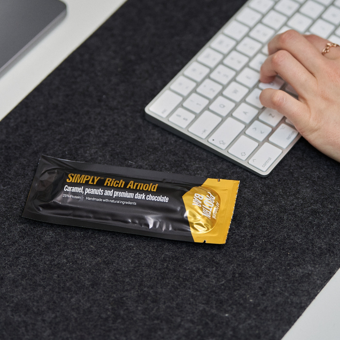 Vul de fruitmand aan met natuurlijke eiwitrepen. Perfect voor de kleine honger tijdens de lange werkdagen.