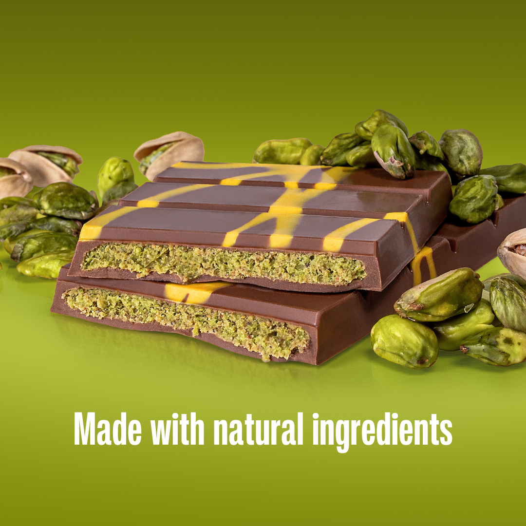 Rijke melkchocolade (ca. 57% cacao) omhult een romige pistachecrème (21%) gemaakt van geroosterde pistachenoten en een vleugje zout die voor een perfecte balans zorgt.